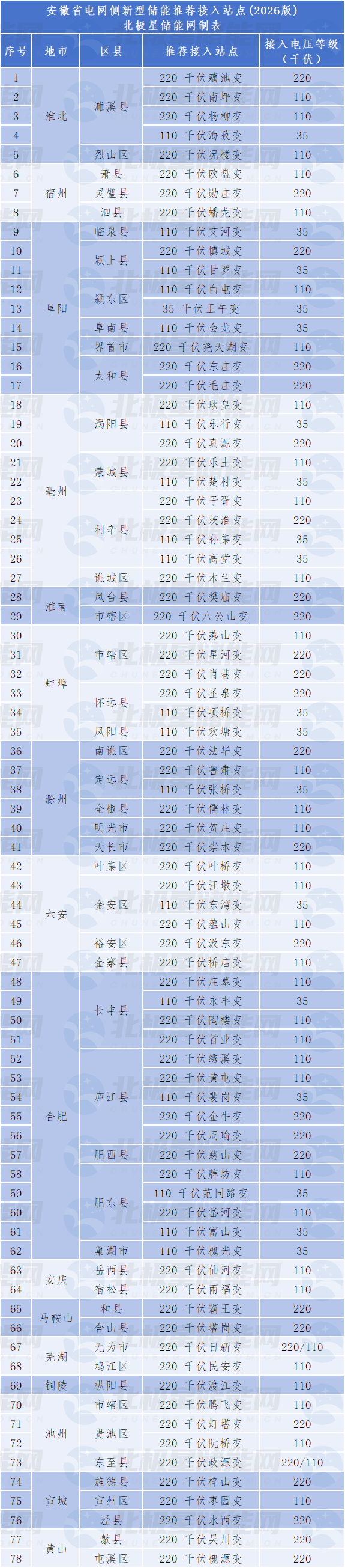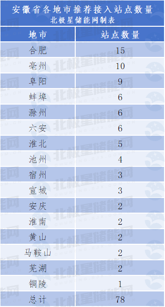 北极星储能网讯:2026年3月19日,安徽省能源局发布《关于征求进一步做好新型储能项目库管理工作(征求意见稿)意见的通知》,其中附件公布了《安徽省电网侧新型储能推荐接入站点(2026 版)》,共计78个站点被推荐。