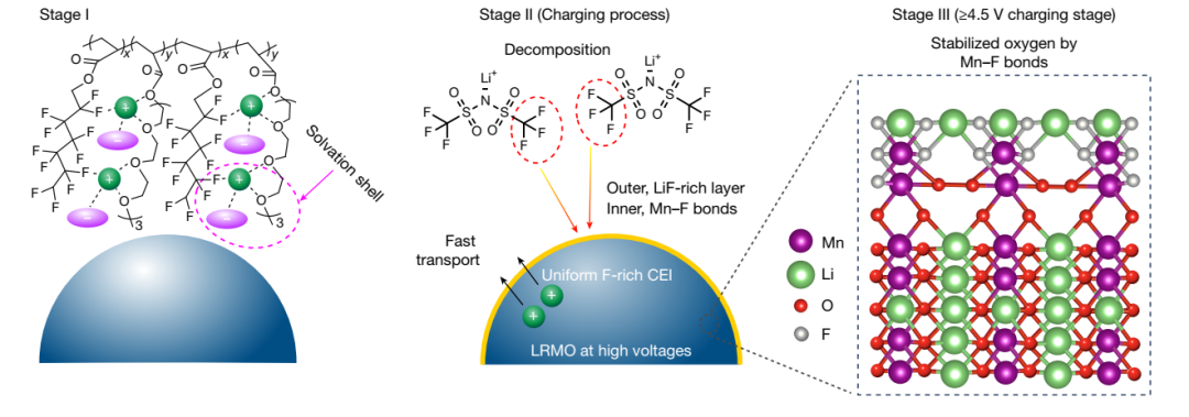 针对以上挑战张强教授团队提出了“富阴离子溶剂化结构”设计新策略,成功开发出一种新型含氟聚醚电解质。该电解质通过热引发原位聚合技术,有效增强了固态界面的物理接触与离子传导能力。团队在聚醚电解质中,引入强吸电子含氟基团,显著提升了其耐高压性能,使其可匹配4.7 V高电压富锂锰基正极,实现了单一电解质对高电压正极与金属锂负极的同步兼容。