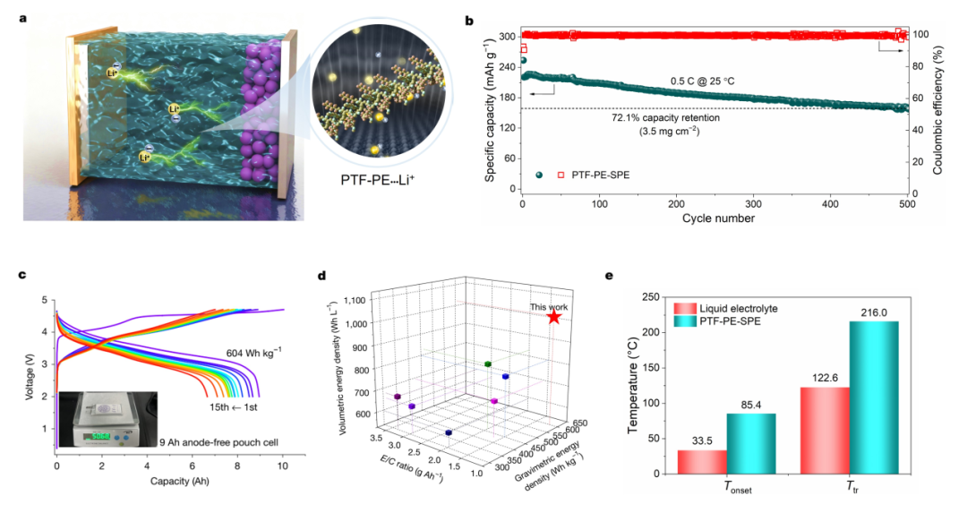 基于含氟聚醚电解质的全电池(a)综合性能卓越:0.5 C循环500次容量保持率72.1%(b);8.96 Ah软包电池能量密度达604 Wh kg⁻¹(c),且显著优于其他体系(d)。热失控起始温度高,顺利通过针刺与热箱测试。