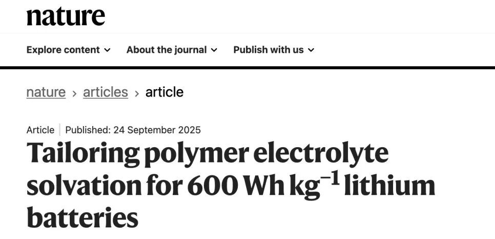 研究成果以“调控聚合物电解质溶剂化结构实现600 Wh kg⁻¹锂电池”为题,于9月24日在线发表于《自然》(Nature)。该研究为开发实用化的高安全性、高能量密度固态锂电池提供了新思路与技术支撑