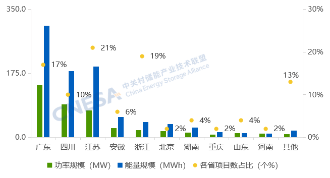 从地区分布来看,新增投运项目主要分布在广东、四川、江苏、安徽、浙江等14个省份。从项目数量上看,华东地区新增投运项目个数占全国的一半,所占市场份额最大。江苏项目个数占比超全国的1/5,居全国首位。