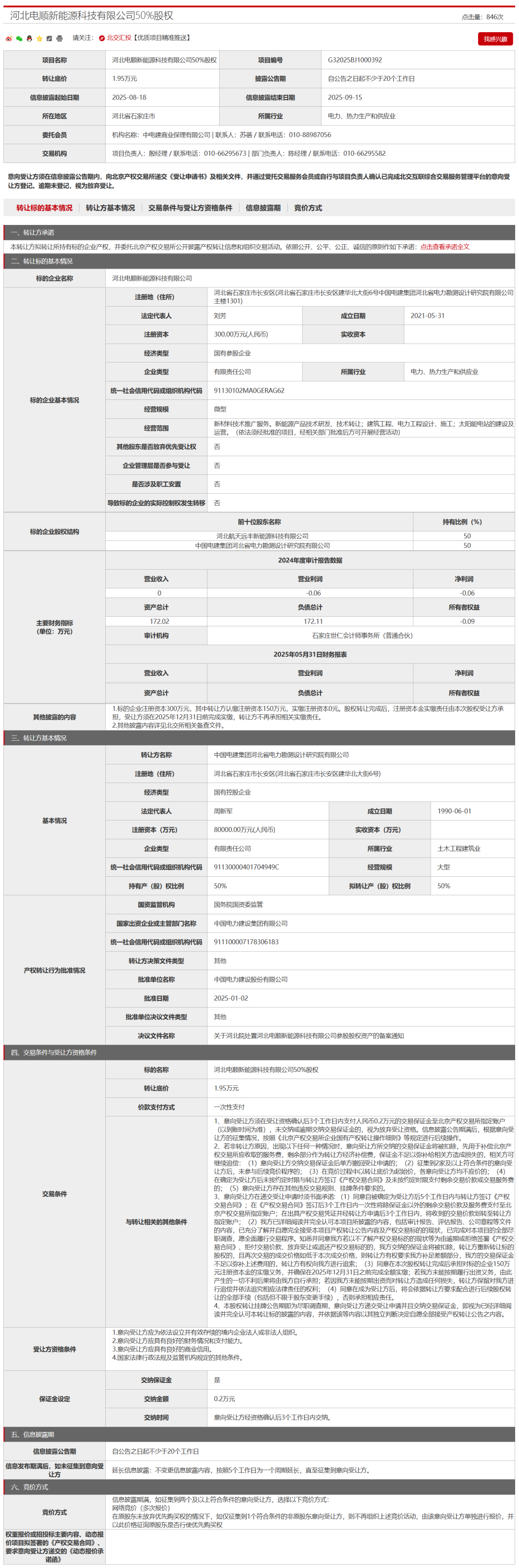 8月18日,中国电建集团河北省电力勘测设计研究院有限公司挂牌转让河北电顺新能源科技有限公司50%股权,转让底价为1.95万元。