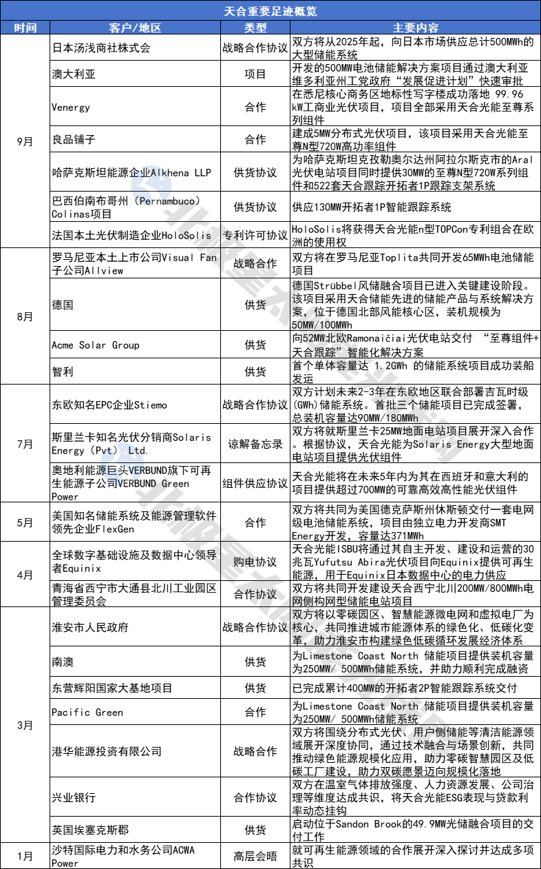 与其他几大龙头相比,天合光能的战略转型则更为全面,在跟踪支架、储能及系统开发早已提前布局之下,今年以来,天合光能的合作也全面开花。并且,在哈萨克斯、北欧等项目中,实现了多业务联合订单。