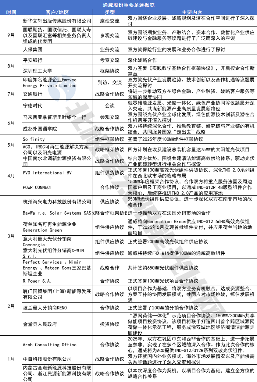 今年以来,通威“朋友圈”扩向大学、银行以及多家能源公司,包括内蒙古金海新能源科技股份有限公司、浙江民源新能源科技有限公司、中自科技股份有限公司、中国南水北调新能源投资有限公司等。与此同时,组件端,通威继续加速海外市场拓展,密集签署了来自欧洲、中东等的战略合作协议。在上半年财报中,通威披露,组件产品已覆盖海外70 余个国家与地区的客户,海外销售占比21%。