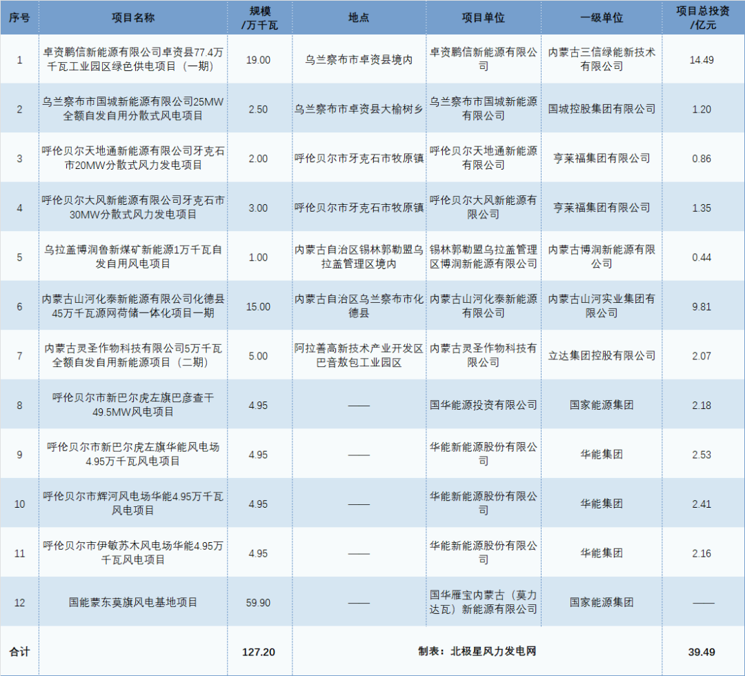 北极星风力发电网获悉,近日,内蒙古12个共计127万千瓦风电项目获核准,项目总投资超39亿元,涵盖工业园区绿色供电、全额自发自用、源网荷储一体化等多种类型,业主包括内蒙古三信绿能、山河实业等地方企业及华能、国家能源集团等央企,项目分布于乌兰察布、呼伦贝尔、锡林郭勒等多地。