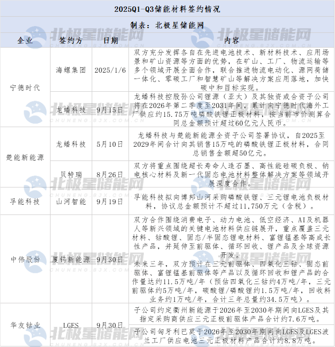 9月29日,中伟股份与厦钨新能源就三元材料、固态锂电材料等签订合作,未来三年供应总量预计达34.5万吨;楚能新能源一方面与贝特瑞聚焦超长寿命人造石墨、高性能硅碳负极、钠电核心材料及新一代固态电池材料解决方案展开合作,另一方面与龙蟠科技签约,预计2025至2029年四年间将采购15万吨磷酸铁锂正极材料,合同金额超50亿元。此外,龙蟠科技、孚能科技、宁德时代等龙头企业也在电池材料方面陆续签约。