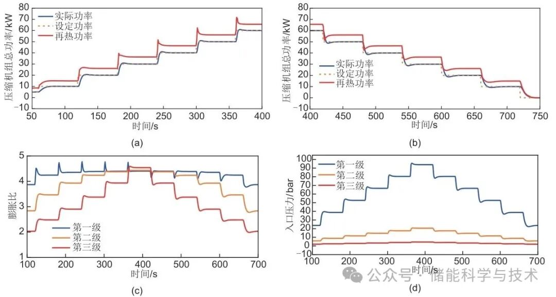 储能、释能过程的功率响应时间定义为当从目标功率阶跃变化开始,到输入、输出功率稳定进入目标功率±5%误差带所经过的时间。这能够反映压缩机、膨胀机组对变化负荷的跟踪能力。