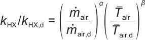 分别为高温侧和低温侧的流体出入口比焓差;HX为换热器;k为表面换热系数;A为有效换热面积。根据换热器一定温差的要求,中冷器、再热器的kHXAHX设计值分别取680 W/K和1800 W/K。不同工况下,换热器的表面换热系数不同,在此选用余热锅炉省煤器表面换热系数经验式(11)为