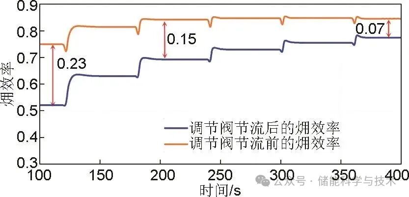 另外,还研究了不同工况下阀门节流的影响,测算了阀门节流后的㶲效率和节流前的㶲效率对比。节流前的空气㶲,以节流阀后的空气㶲值作为输入㶲。