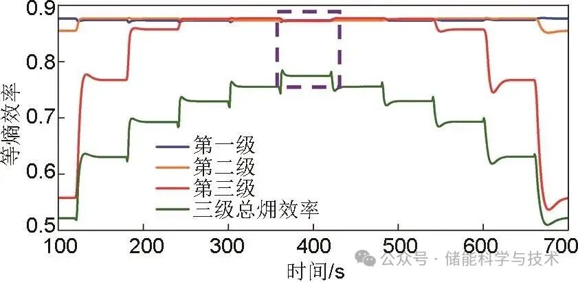 图9是变负荷过程中,考虑调节阀节流影响前、后计算的实时㶲效率变化曲线对比。可以看出,若不考虑阀门节流效应的影响,则设计工况下的㶲效率稍微低于各级的设计等熵效率。随着负荷率减小,阀门节流的影响变得更加明显。输出功率为10 kW(16.7%负荷率)下,节流产生的㶲效率减少量高达0.23,而30 kW(50%负荷率)和60 kW(100%负荷率)下这一值分别为0.15和0.07。其原因是低负荷下阀门开度更小,阀后的空气被节流到了一个更小的压力。从10 kW负荷提升到60 kW,膨胀段的㶲效率从0.52增加至0.78,不计节流损失的㶲效率从0.75增加至0.85。