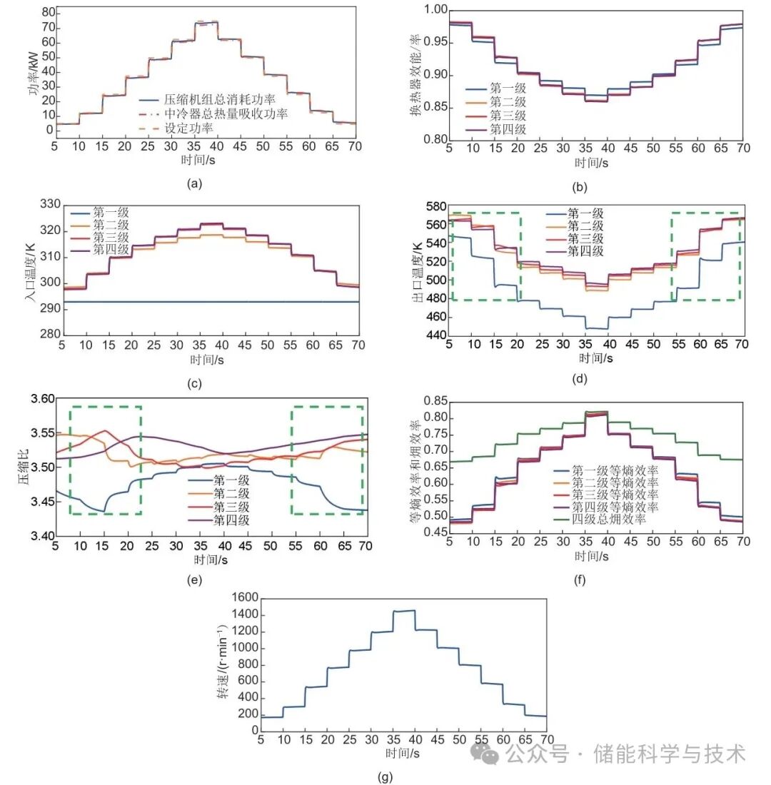 图6 负荷连续阶跃变化下压缩机组各级热力学参数的变化曲线。(a) 压缩机组总功率和中冷器总热量吸收功率变化曲线; (b) 各级中冷器换热效能变化曲线;(c) 各级压缩机入口温度变化曲线;(d) 各级压缩机出口温度变化曲线;(e) 各级压缩机压比变化曲线;(f) 压缩机等熵效率变化曲线;(g) 压缩机组转速变化曲线