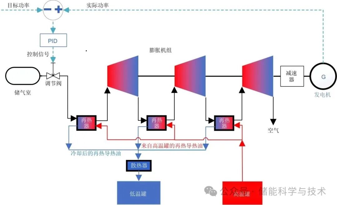 图5为释能过程的负荷调节策略,其类似于电厂汽轮机的控制策略,该释能控制系统的执行部件为调节阀,根据实测功率与目标功率的偏差向调节阀输出控制信号。发电机额定转速为3000 r/min。