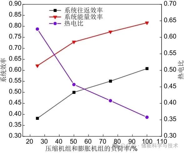 图10为不同负荷率下的Micro CAES系统充放电循环特性,可以看出:在压缩机组和膨胀机组运行于相同负荷率的充放电循环中,充放电循环的往返效率和㶲效率均随负荷率减小而降低。从100%负荷到25%负荷,往返效率将从0.61下降到0.38,能量效率也将从0.82下降到0.62。但热电比从0.36增加到0.63。这表明Micro CAES系统在压缩机组和膨胀机组都按相同负荷率运行的时候,虽然往返效率和能量效率均降低,但供热能力增强。