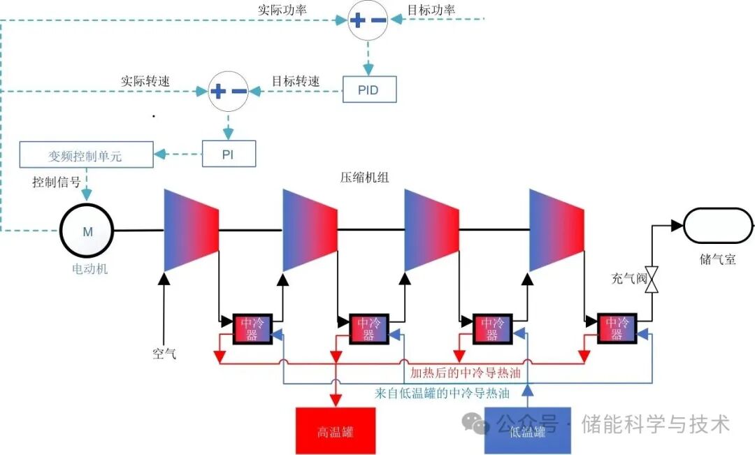 储能过程的负荷调节方法如图4所示,首先,按照目标功率与实际功率的偏差,求解出目标转速;再按照目标转速和实际转速的偏差,改变三相异步电机的转速,从而改变压缩机组的输入功率,实现压缩机组的负荷调节。电动机额定转速为1500 r/min,与各级压缩机均相同。