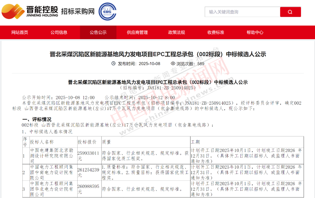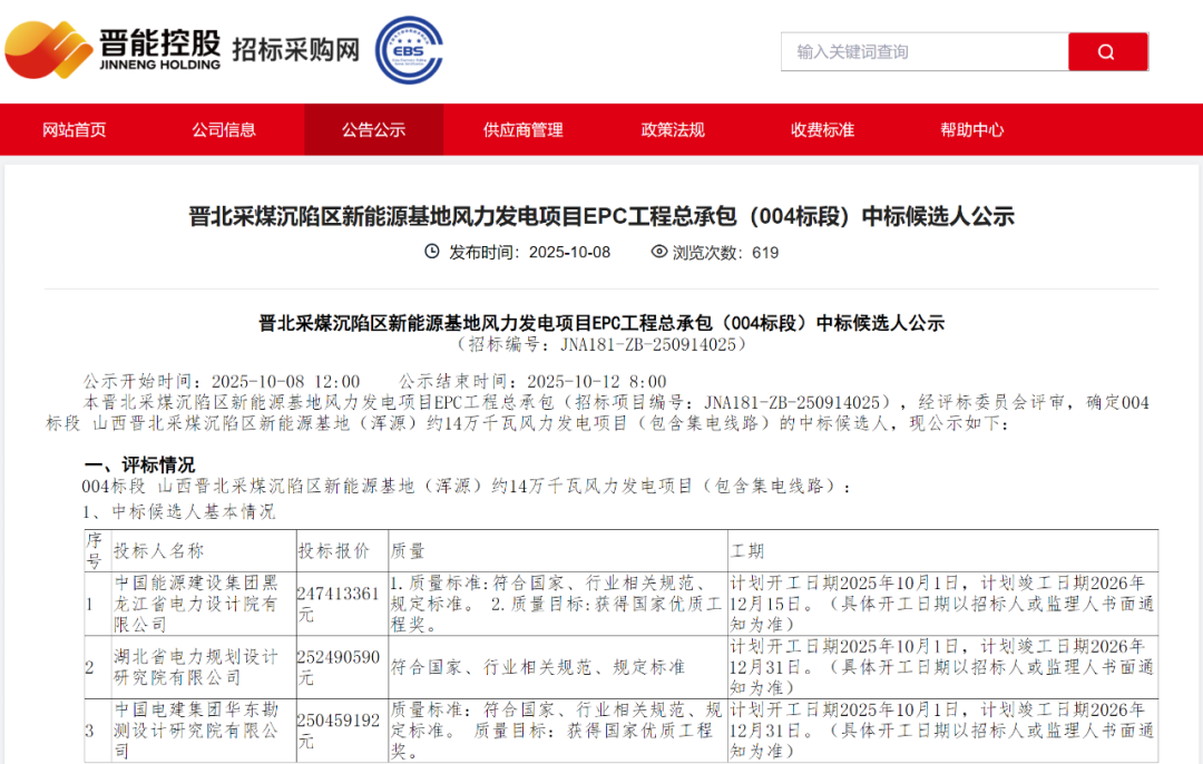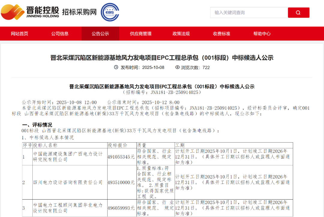 北极星风力发电网获悉,10月8日,晋北采煤沉陷区新能源基地风力发电项目EPC工程总承包中标候选人公示,共四个标段,风电项目规模共计1GW。