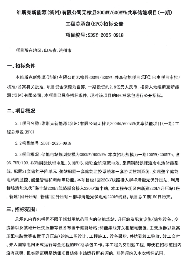 北极星储能网讯:9月30日,维斯克新能源(滨州)有限公司山东无棣县300MW/600MWh共享储能项目(一期)EPC招标发布,项目资金来源为自筹资金28000万元,折合单价约1.4元/Wh。招标人为维斯克新能源(滨州)有限公司,是中能绿投(山东)新能源产业有限责任公司旗下子公司。